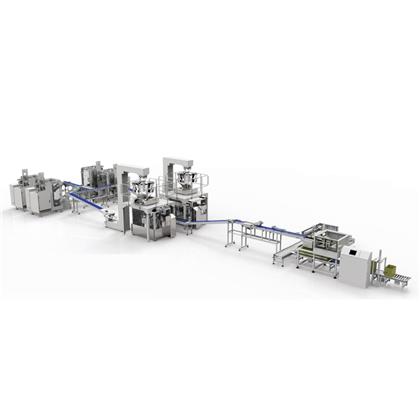 2、生產(chǎn)線配置有立式包裝機(jī)若干臺(tái)+小包整理輸送線+斗式提升機(jī)+電腦組合秤+電子稱架